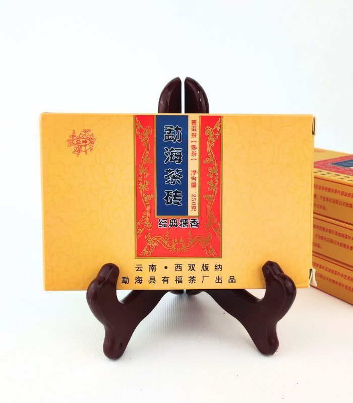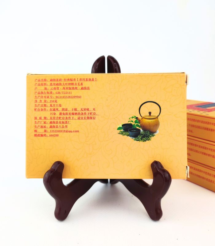 Найменування продукту: Витримана чайна цегла (стиглий чай) Склад: Юньнанський крупнолистовий висушений на сонці зелений чай. Вміст нетто: 250г Походження: Куньмін, Юньнань Дата сировини: 2009 рік Дата виготовлення: 2017 рік