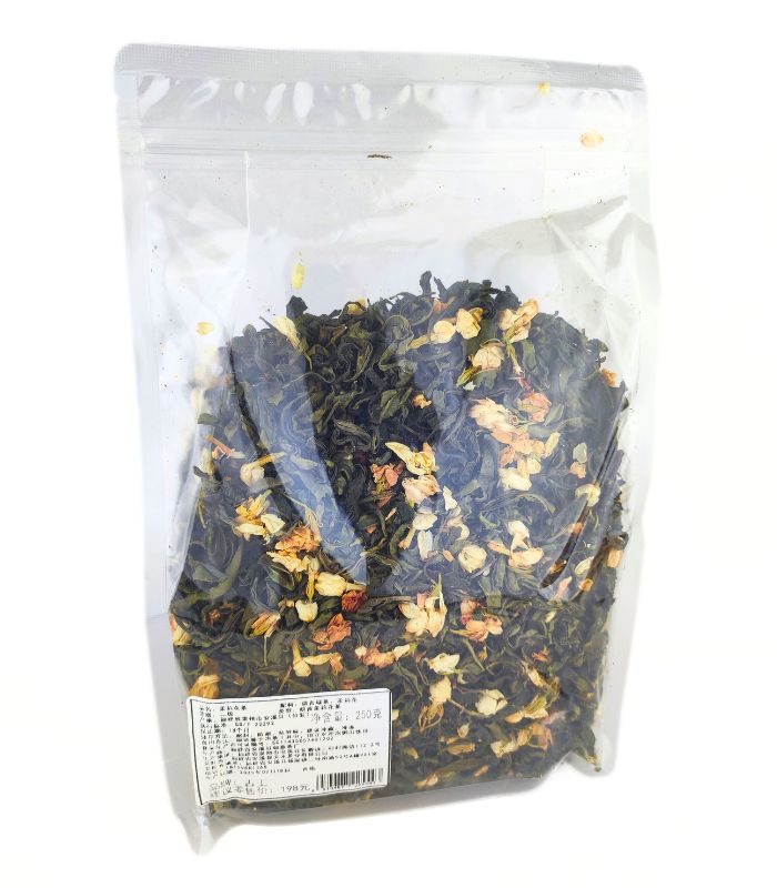 Жасминовий зелений чай, також відомий як Молі Хуача. Цей високоякісний зелений чай поставляється в зручному пакеті вагою 250 грам, де дбайливо збережене темно-зелене скручене чайне листя, змішане з ніжними квітами жасмину.
