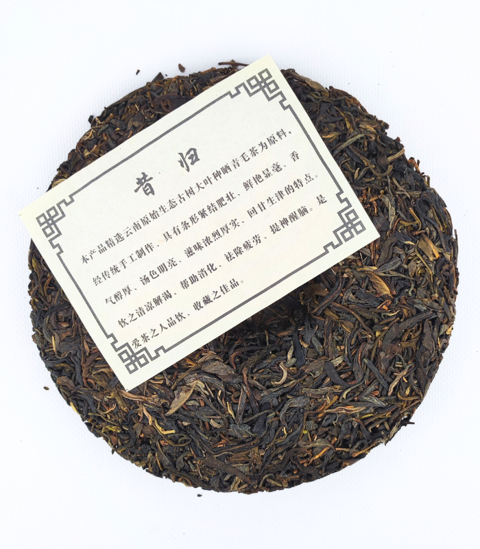 В якості сировини для цього продукту, вибраний висушений на сонці зелений чай з оригінальних екологічних древніх дерев Юньнані з великим листям. Він виготовлений традиційним методом. Має характеристики щільних і товстих смужок, яскравої і чистої сировини, м’якого аромату, яскравого кольору настою, сильний і густий смак і солодкий післясмак, що стимулює вироблення рідини в організмі. Пийте його, щоб вгамувати спрагу, покращити травлення, зняти втому і освіжити розум. Це відмінний продукт для любителів чаю, який можна пити та збирати.