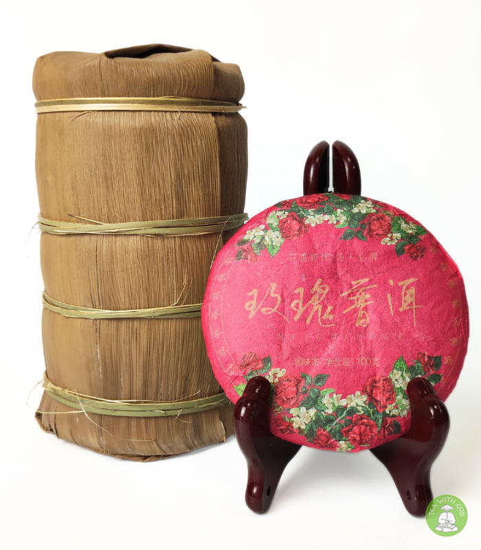 Крупнолистовий чай Шу Пуер з листям троянди. Пелюстки троянд надають йому квітковий аромат та незвичайний смак для пуеру. Настій темний та щільний, трохи з червоними нотками. Класно бадьорить та стимулює роботу мозку на протязі дня.