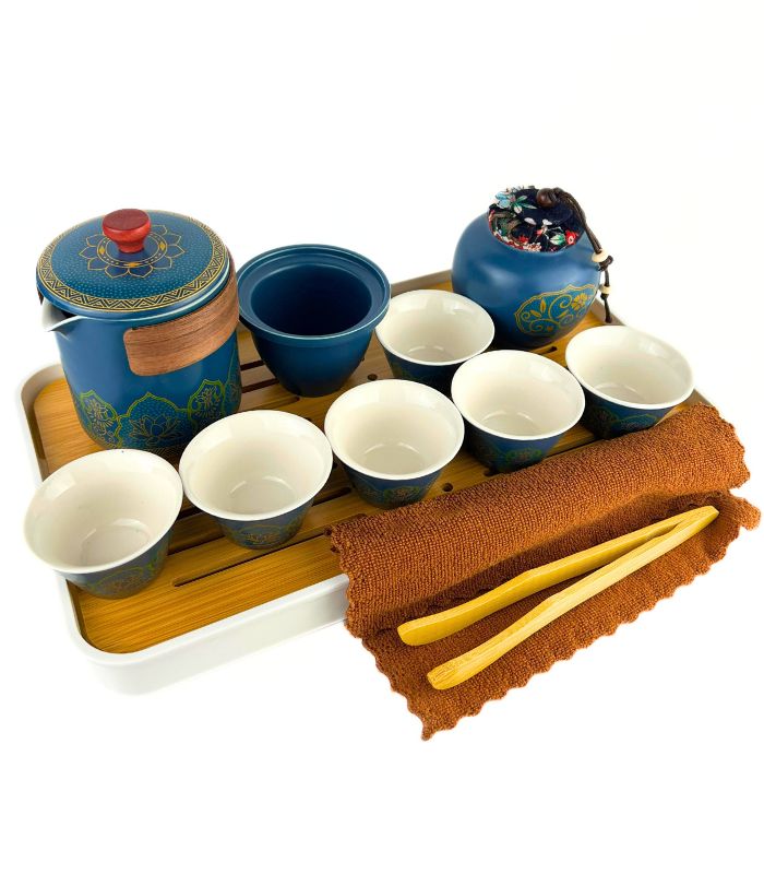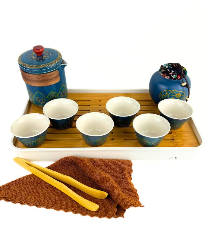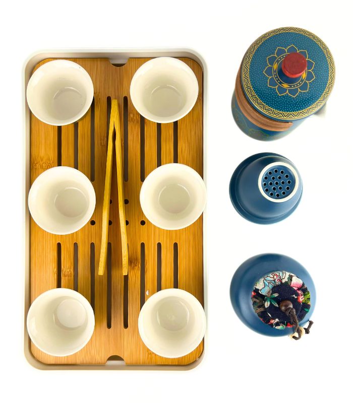 Посуд виготовлений із високоякісної кераміки в глибокому синьому кольорі з золотим візерунком. Орнамент додає вишуканості та відсилає до традицій китайської культури. Бамбукова дошка гармонійно поєднує натуральність із практичністю, а кейс надійно захищає посуд.