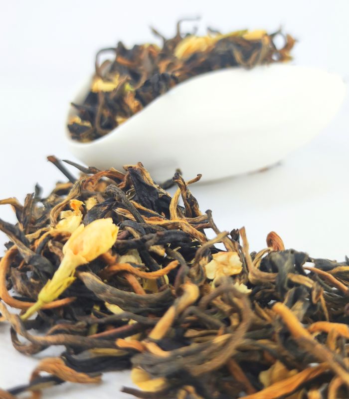 Червоний чай Дянь Хун з жасміном – це вишуканий китайський чай, який поєднує в собі насичений смак червоного чаю з ніжним ароматом жасміну. Вирощений у провінції Юньнань, цей чай виготовляється з молодих чайних листочків і ніжних бруньок, які збираються вручну. Після збору листя проходить процес ферментації, що надає чаю глибокий, багатий смак з нотками сухофруктів і меду.