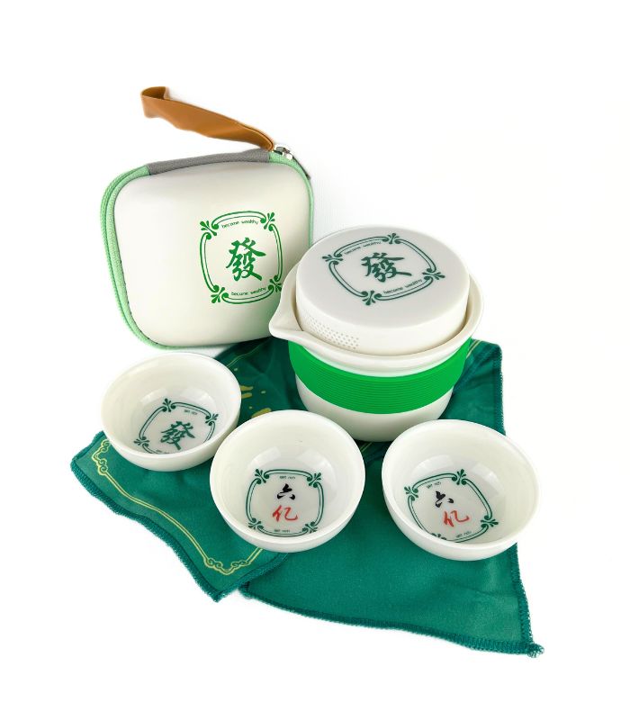 Набір поставляється у стильному, міцному чохлі на блискавці. Чохол гарантує, що порцеляна залишиться цілою, а його компактний розмір дозволяє легко помістити набір у рюкзак чи ручну поклажу. На чохлі та посуді нанесений ієрогліф 發 (Fā), що символізує процвітання та успіх.