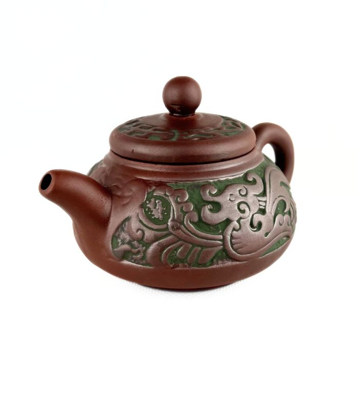 • Кольори: Теплий, глибокий коричнево-червоний відтінок глини (характерний для Цзиша або Чжу Ні) контрастує з яскраво-зеленими вставками, що створює візуально привабливий та дорогий вигляд.