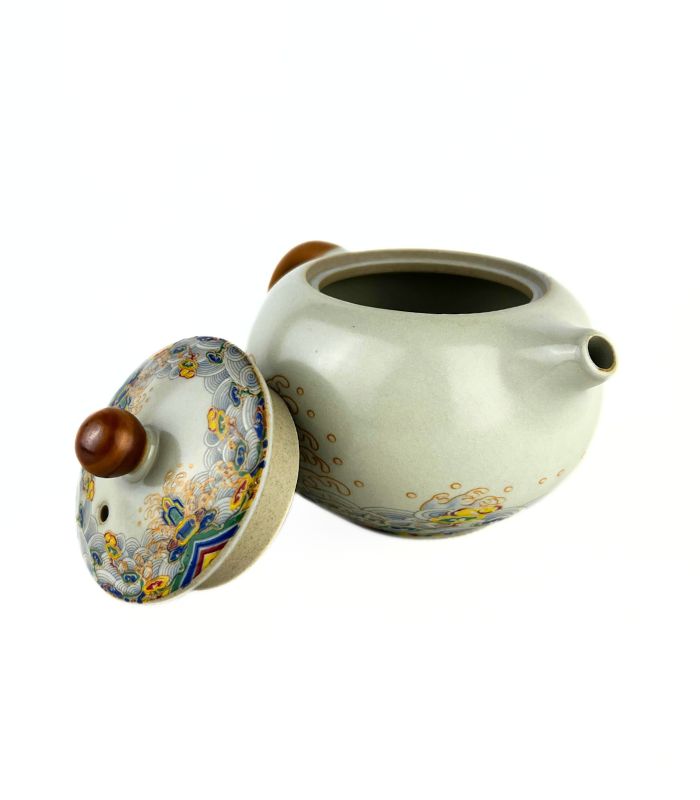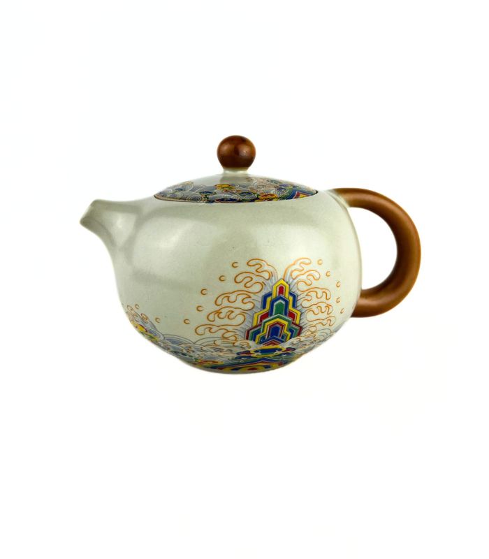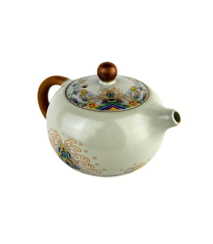 Корпус чайника виконаний із високоякісної кераміки світлого відтінку з глянцевою поверхнею. Його прикрашає вишуканий орнамент у яскравих кольорах, що поєднує елементи хвиль і геометричних фігур. Кришка та корпус гармонійно доповнені дерев’яною ручкою та кнопкою на кришці, які створюють природний баланс і зручність у використанні.