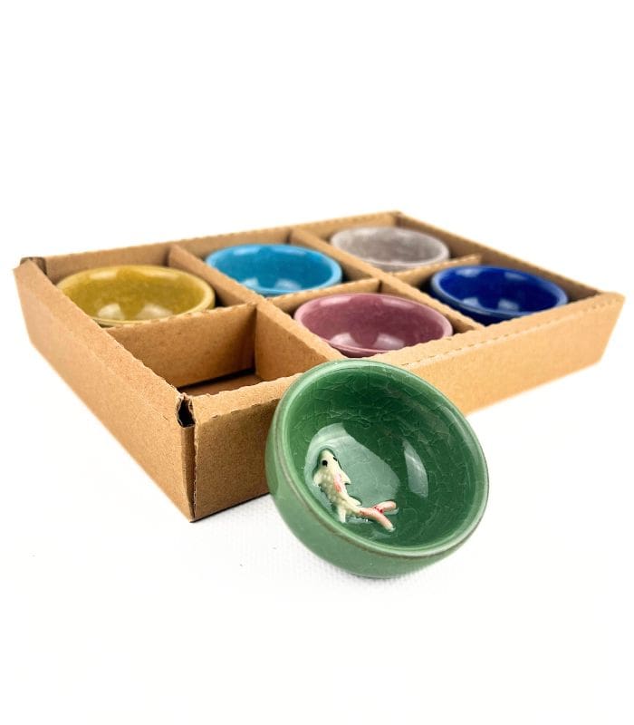 Набір керамічних чайних піал із об’ємною фігуркою коропа Коі. Ефектний стиль “кракле” та яскраві кольори роблять кожну чашу унікальною. Ідеально підходить для чайних церемоній та колекціонерів.