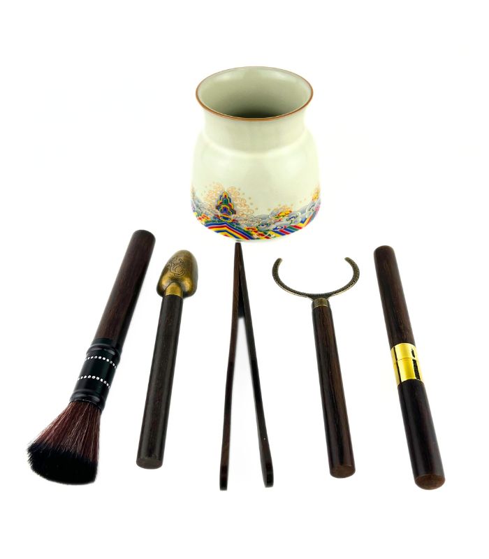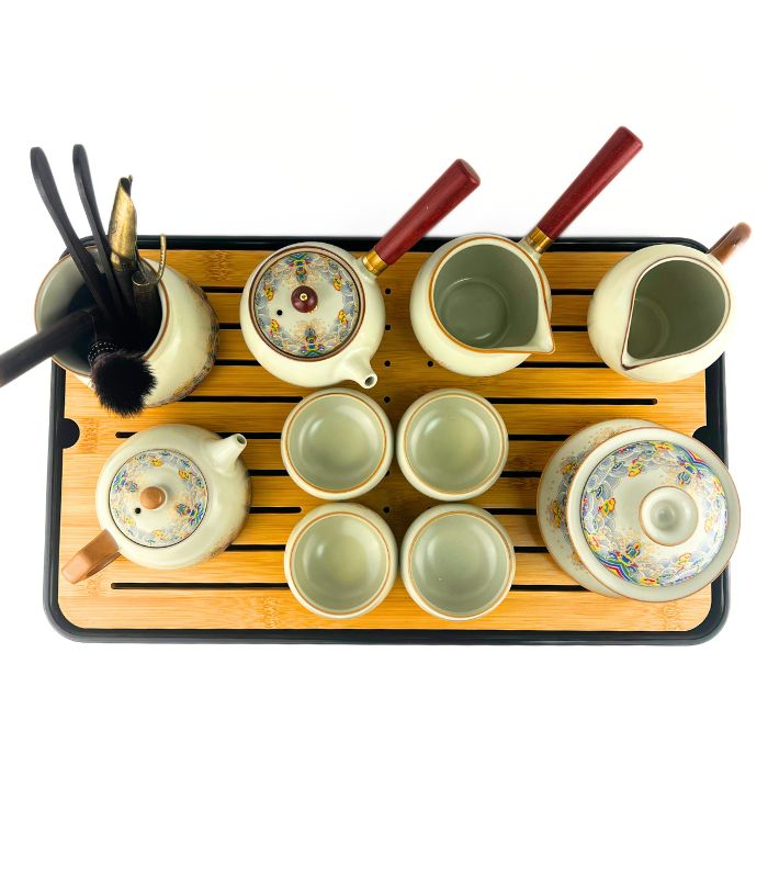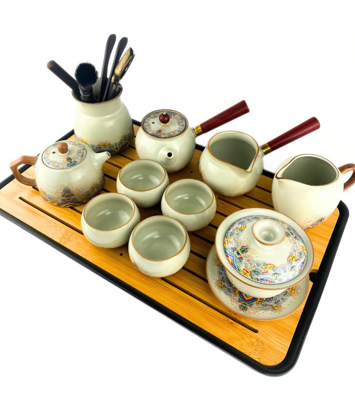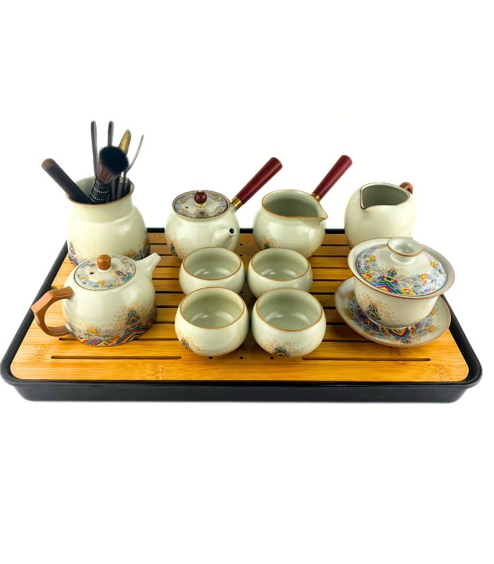 Комплексний набір містить усі необхідні інструменти для проведення професійної чайної церемонії вдома або в офісі. Посуд виготовлений із високоякісної кераміки світло-бежевого відтінку, прикрашеної традиційним багатоколірним орнаментом, що створює особливу атмосферу під час чаювання.
