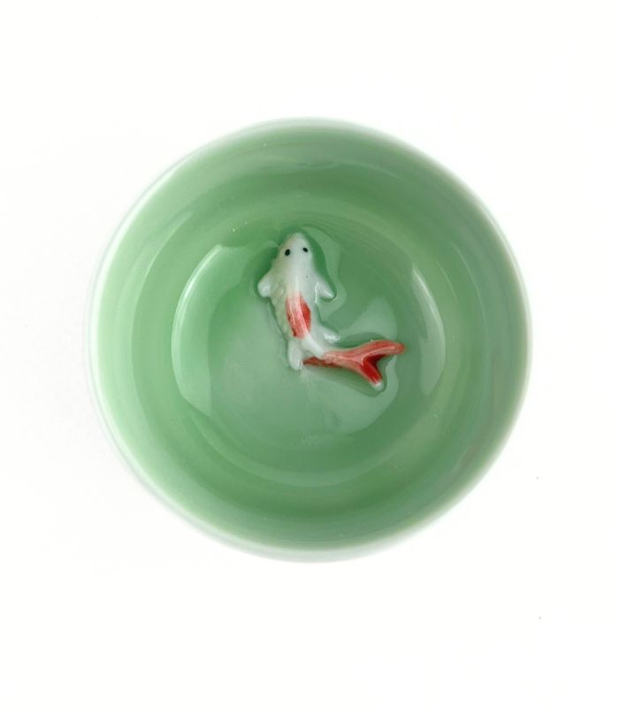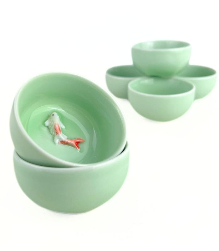 Набір керамічних чайних піал із об’ємною фігуркою коропа Коі. Ефектний стиль “кракле” та яскраві кольори роблять кожну чашу унікальною. Ідеально