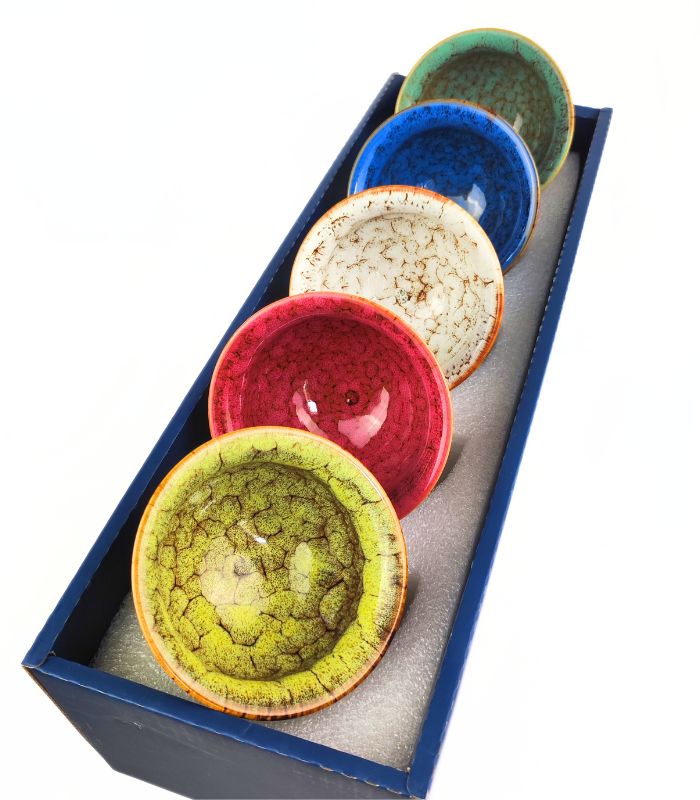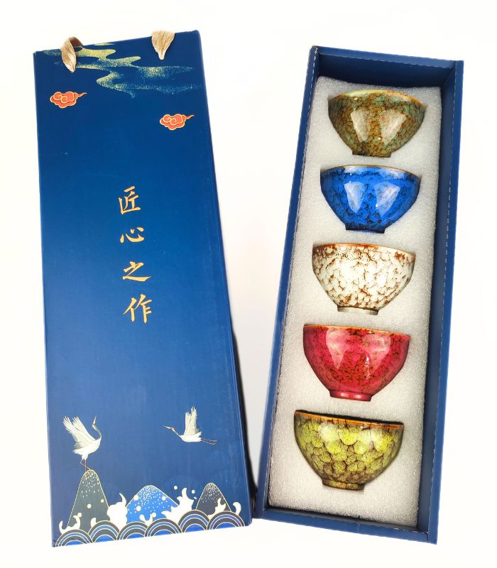 Пориньте у світ вишуканого чаювання з набором із п’яти різнокольорових піал. Кожна піала виконана з високоякісної кераміки та прикрашена унікальною глазур’ю, що надає їй неповторного відтінку. Ці піали ідеально підходять для традиційних чайних церемоній та повсякденного використання, додаючи яскраві фарби у ваш чайний ритуал.