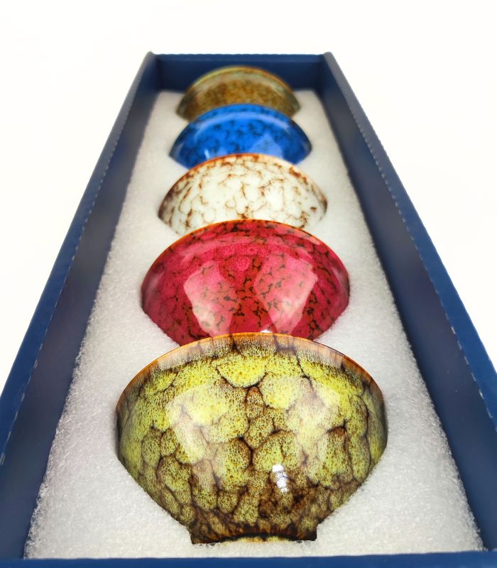 Пориньте у світ вишуканого чаювання з набором із п’яти різнокольорових піал. Кожна піала виконана з високоякісної кераміки та прикрашена унікальною глазур’ю, що надає їй неповторного відтінку. Ці піали ідеально підходять для традиційних чайних церемоній та повсякденного використання, додаючи яскраві фарби у ваш чайний ритуал.