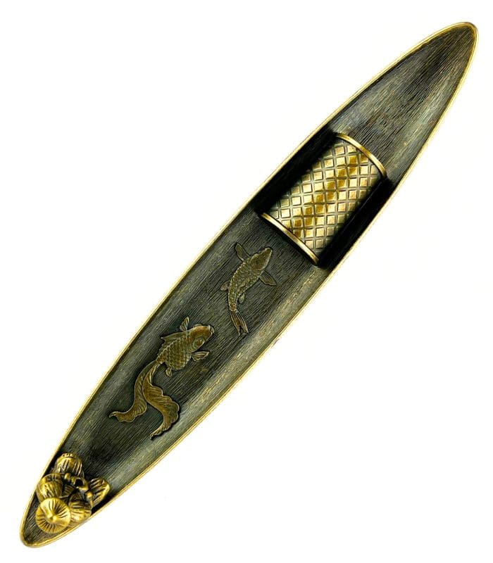 Підставка поєднує в собі витонченість східної культури та глибоку символіку. Виготовлена з металу в стилі “під бронзу”, прикрашена фігурками коропів коі — символів довголіття, достатку та наполегливості.