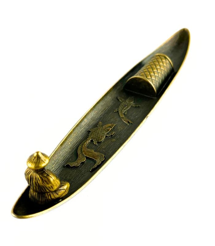 Підставка поєднує в собі витонченість східної культури та глибоку символіку. Виготовлена з металу в стилі “під бронзу”, прикрашена фігурками коропів коі — символів довголіття, достатку та наполегливості.