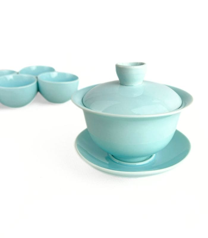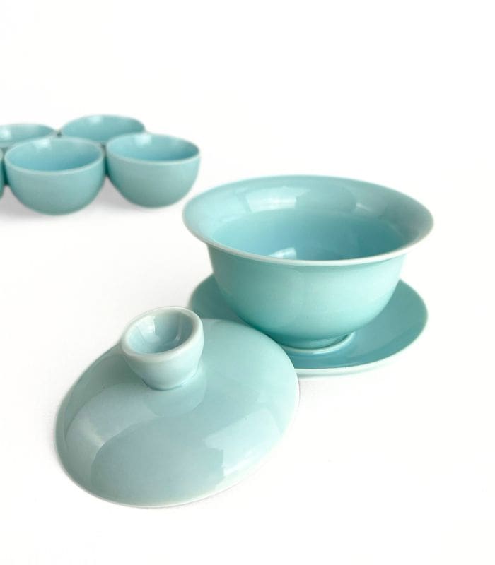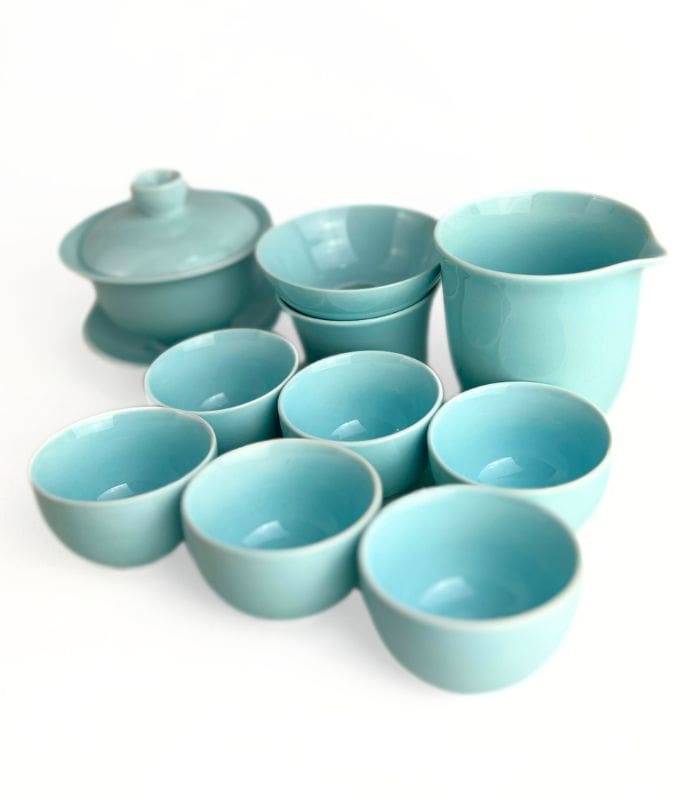 Подарунковий набір китайського чайного посуду з глазурованого фарфору у стильному червоному кейсі. Ідеальний для приготування традиційного чаю гунфу ча. У комплекті: гайвань, піали, чахай та чашечки. Елегантний дизайн із блакитним покриттям та міцним матеріалом робить набір чудовим подарунком для цінителів чаю. Упаковка у традиційному китайському стилі підходить для будь-яких урочистих заходів.