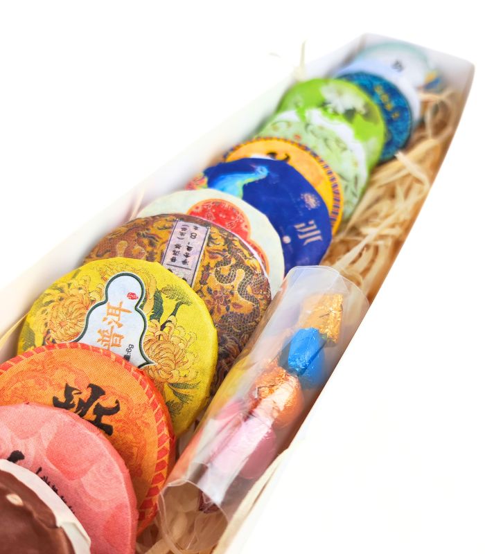 Подарунковий набір китайського чаю включає 16 видів пресованих чаїв та 10 порцій смоли пуеру. У складі — білий чай, шен пуер, шу пуер та варіанти з мандарином, жасмином, піоном і хризантемою. Вишуканий вибір для поціновувачів елітного китайського чаю. Ідеальний подарунок для чайного гурмана!