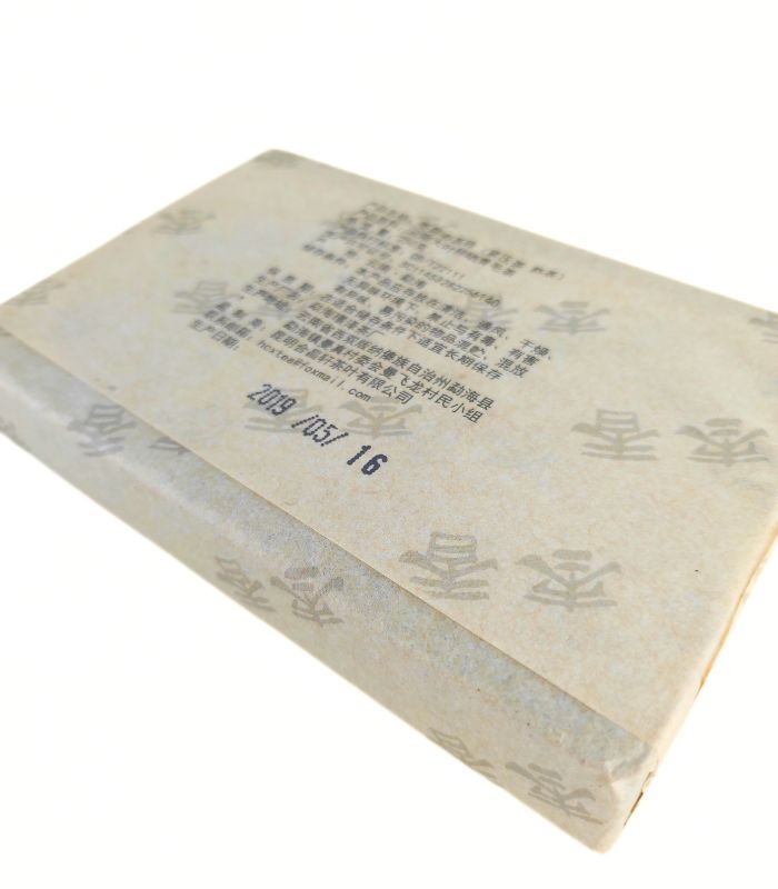 Найменування продукту: Витримана чайна цегла (стиглий чай) Склад: Юньнанський крупнолистовий висушений на сонці зелений чай. Вміст нетто: 250г Походження: Куньмін, Юньнань Дата сировини: 2009 рік Дата виготовлення: 2017 рік