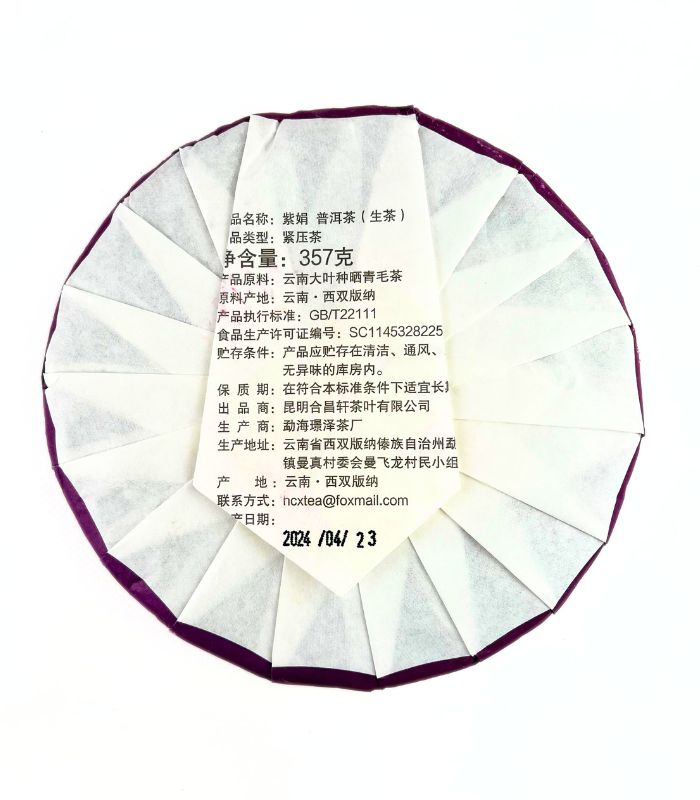 Назва продукту: Торт Menghai, чай Pu'er (приготовлений чай) Матеріал: висушений на сонці зелений чай з крупнолистого сорту Менхай в провінції Юньнань: Сішуанбаньна Дайський автономний округ Юньнань. Маса нетто: 357 г/торт Умови зберігання: у чистому, провітрюваному, сухому місці, захищеному від сонячних променів.