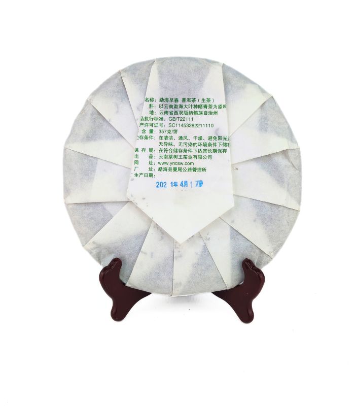 Назва продукту: Торт Menghai, чай Pu'er (приготовлений чай) Матеріал: висушений на сонці зелений чай з крупнолистого сорту Менхай в провінції Юньнань: Сішуанбаньна Дайський автономний округ Юньнань. Маса нетто: 357 г/торт Умови зберігання: у чистому, провітрюваному, сухому місці, захищеному від сонячних променів.
