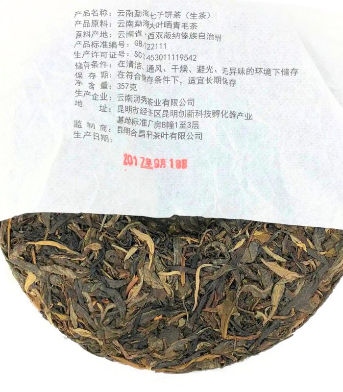 Назва продукту: Торт Menghai, чай Pu'er (приготовлений чай) Матеріал: висушений на сонці зелений чай з крупнолистого сорту Менхай в провінції Юньнань: Сішуанбаньна Дайський автономний округ Юньнань. Маса нетто: 357 г/торт Умови зберігання: у чистому, провітрюваному, сухому місці, захищеному від сонячних променів.