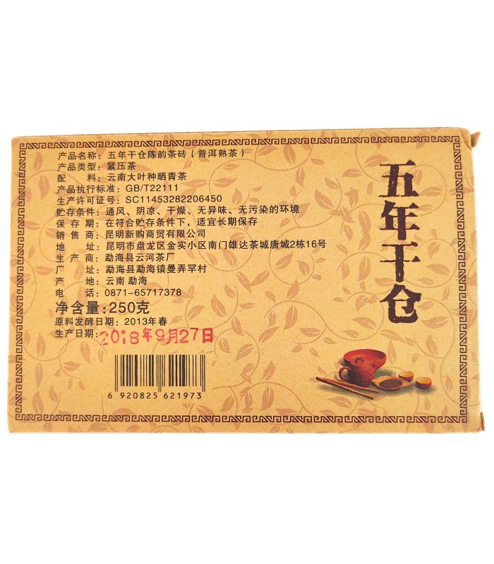 Цеглинка витриманого чаю Пуер «П’ятирічна цегла» — це стиглий пуер вагою 250 грам, створений із добірної сировини 2013 року, витриманої у відповідних умовах до 2018 року. Має глибокий аромат із нотками землі та деревини, а також насичений темно-бурштиновий настій. Ідеально підходить для любителів витриманих пуерів і колекціонерів. Завдяки високій якості листя чай добре зберігається та стає ще кращим із часом.