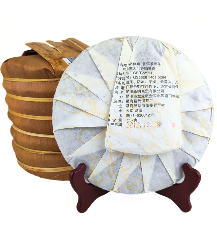 Назва продукту: Торт Menghai, чай Pu'er (приготовлений чай) Матеріал: висушений на сонці зелений чай з крупнолистого сорту Менхай в провінції Юньнань: Сішуанбаньна Дайський автономний округ Юньнань. Маса нетто: 357 г/торт Умови зберігання: у чистому, провітрюваному, сухому місці, захищеному від сонячних променів.