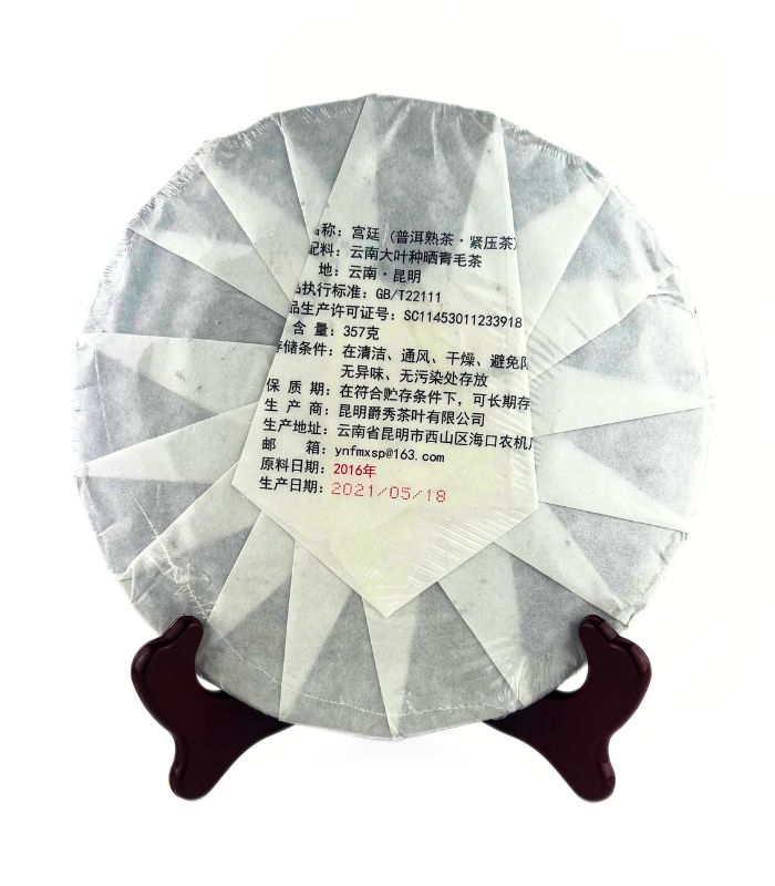 Цей пресований Шу Пуер (Палацовий) виготовлений із високоякісної сировини Юньнаньського великолистного чайного дерева. Чай поєднує в собі витриманість сировини 2016 року та делікатне пресування, виконане у 2021 році фахівцями компанії Kunming Juexiu Tea Co., Ltd.