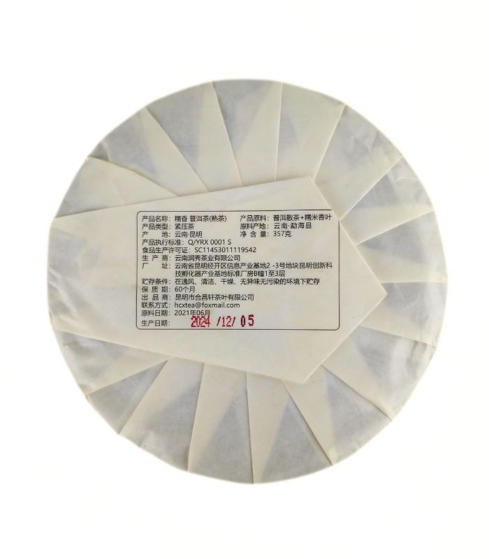 Назва продукту: Торт Menghai, чай Pu'er (приготовлений чай) Матеріал: висушений на сонці зелений чай з крупнолистого сорту Менхай в провінції Юньнань: Сішуанбаньна Дайський автономний округ Юньнань. Маса нетто: 357 г/торт Умови зберігання: у чистому, провітрюваному, сухому місці, захищеному від сонячних променів.