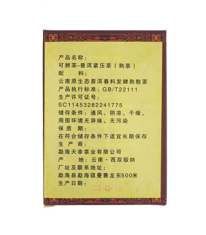 Найменування продукту: Витримана чайна цегла (стиглий чай) Склад: Юньнанський крупнолистовий висушений на сонці зелений чай. Вміст нетто: 250г Походження: Куньмін, Юньнань Дата сировини: 2009 рік Дата виготовлення: 2017 рік