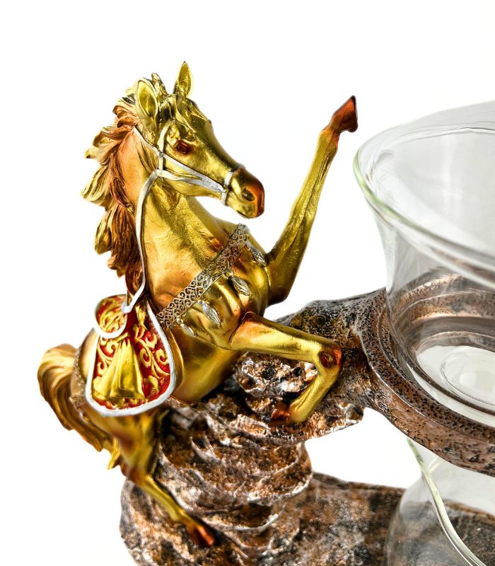 • Естетичний дизайн: тримач виконаний у формі деталізованої золотистої статуетки коня, що стоїть на декоративній основі, яка імітує камінь.