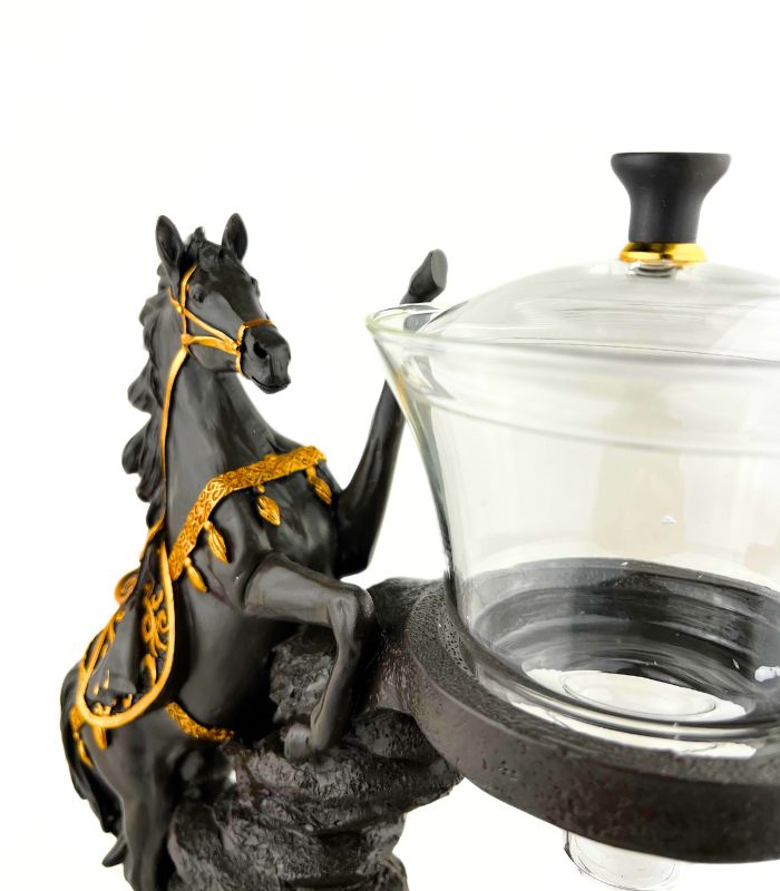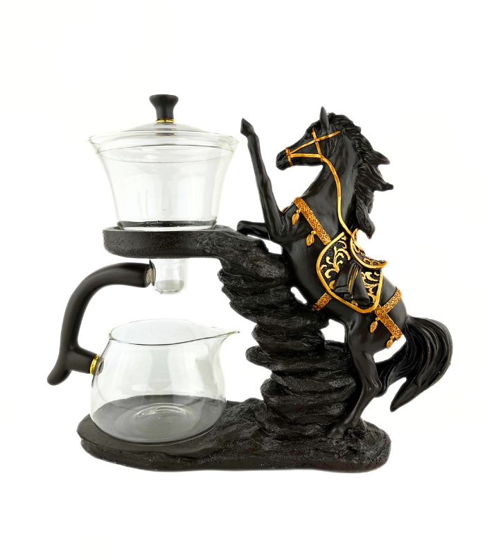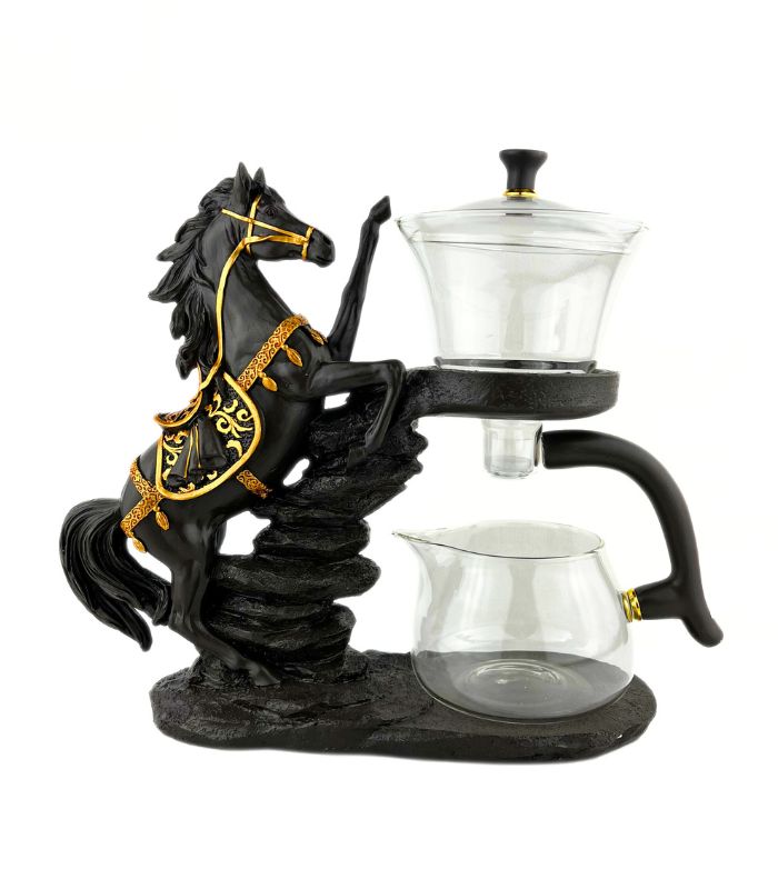 • Естетичний дизайн: Підставка у формі вороного коня з золотистими елементами виконує роль надійного тримача та декоративного елемента чайної зони.