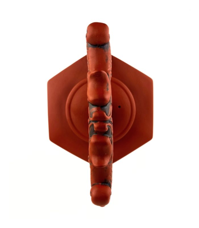 Чайник «Шестиугольный Дракон» — это редкое сочетание большого объема (2800 мл) и изящной художественной обработки. Его дизайн основан на контрасте теплой терракотовой глины и темных рельефных панелей, что создает эффект старинного артефакта. Форма «Ти Лян» с высокой неподвижной ручкой исторически считалась признаком благородства и статуса хозяина дома.