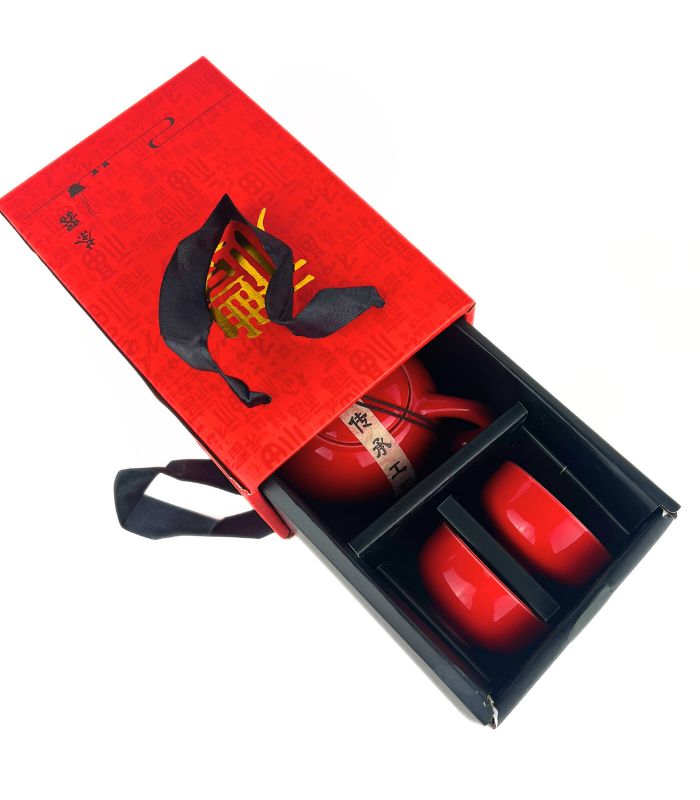 Чайный набор керамический красный (чайник + 2 пиалы) в подарочной коробке
