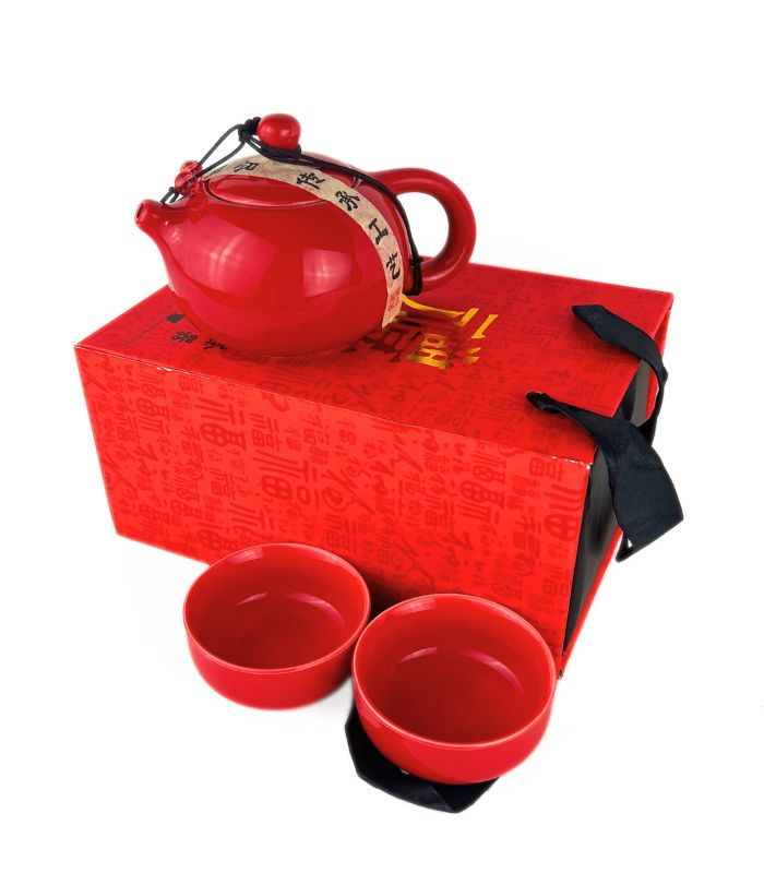 Чайный набор керамический красный (чайник + 2 пиала) в подарочной коробке