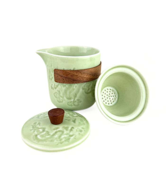 Этот дорожный чайный набор – идеальное решение для тех, кто не хочет отказываться от китайской чайной церемонии (Гун Фу Ча) даже вдали от дома. Набор выполнен из керамики с светло-зеленой глазурью, имитирующей нефрит, а элементы посуды украшены рельефным изображением Дракона, символа удачи и силы.