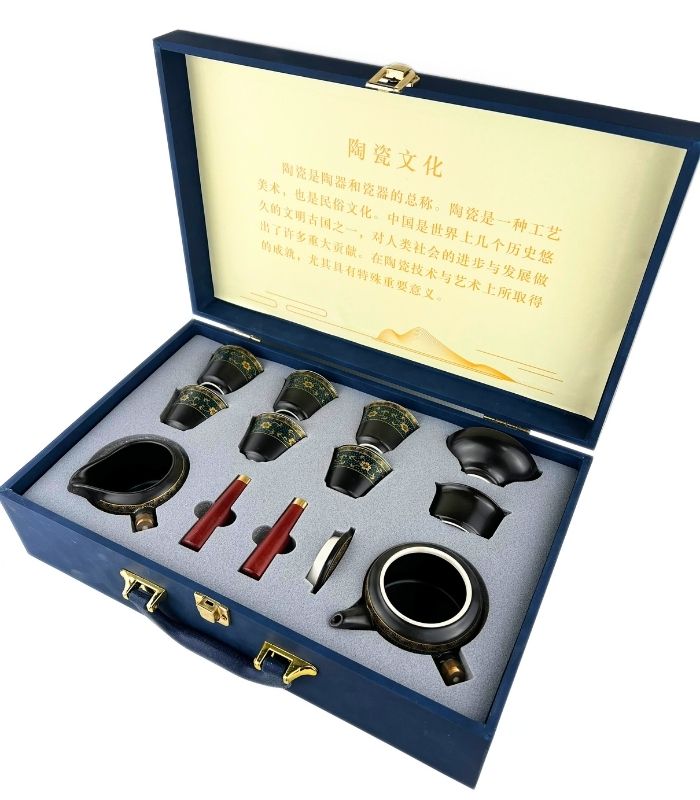 Набор для Чайной Церемонии на 6 Персон в Кейсе – это идеальное решение для проведения традиционного чаепития Гун Фу Ча в любом месте: дома, на работе или во время путешествий. Элегантный сервиз, упакованный в стильный защитный серый кейс, обеспечивает безопасность и мобильность посуды. Изысканный дизайн, исполненный в темных тонах с золотым орнаментом, подчеркнет важность момента чаепития и станет отличным подарком для ценителей качественного китайского чая.