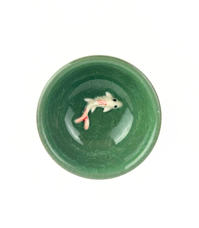 Набор керамических чайных пиалов с объемной фигуркой карпа Кои. Эффектный стиль «кракле» и яркие цвета делают каждую чашу уникальной. Идеально подходит для чайных церемоний и коллекционеров.