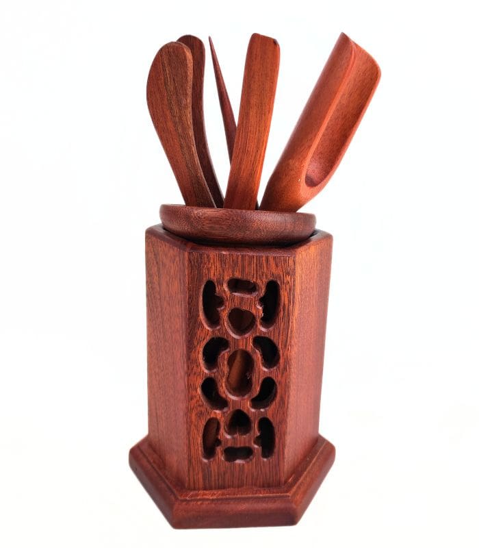 Этот набор чайных инструментов из натурального бамбука станет незаменимым помощником в любой чайной церемонии. В комплект входят необходимые аксессуары для обслуживания чайной посуды: лопатка, щипцы, воронка и шпатель. Все инструменты удобно хранятся в резном бамбуковом подставке, выполненном в традиционном китайском стиле, что добавляет эстетики вашему чайному ритуалу. Натуральный бамбук не только экологичен, но и долговечен, гарантируя долгую службу набора. Прекрасно подходит как для профессионалов, так и для начинающих любителей китайской чайной культуры.