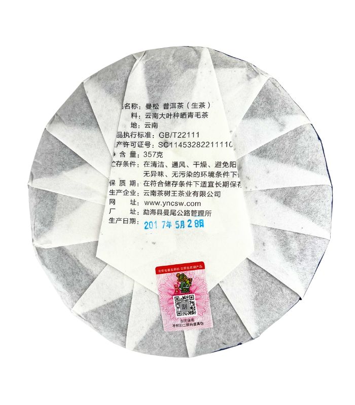 Шен Пуэр «Мэнсонг» – это зрелый чайный блин (Bin Cha) весом 357 граммов, изготовленный в 2017 году. ТМ «Король Чайного Дерева» — Чашуван, чай изготовлен из высококачественного сырья из известного региона Мань Сун в провинции Юньнань.