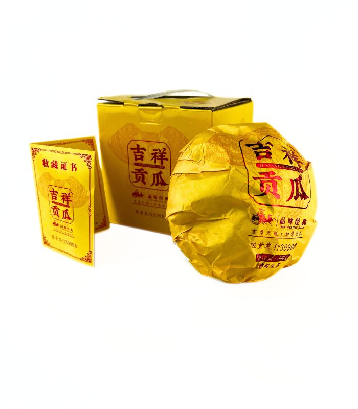 Шен Пуэр Золотая Тыква — это изысканный коллекционный артефакт. Название «Цзи Сян Гун Гуа» (Благоприятная Придворная Тыква) подчеркивает высокий статус этого чая, который когда-то подносили к императорскому двору. Этот Прессированный Пуэр в форме тыквы весом 500 грамм сочетает в себе традиционный символизм с практической ценностью элитного чая.